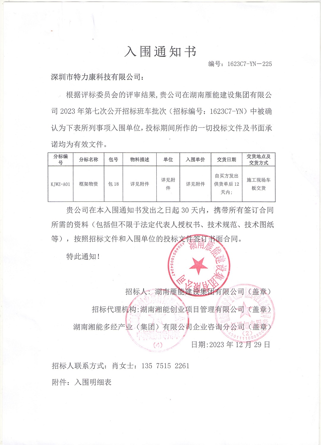 根據(jù)評標(biāo)委員會的評審結(jié)果,我司在湖南雁能建設(shè)集團有限公司2023年第七次公開招標(biāo)班車批次(招標(biāo)編號:1623C7-YN)中表現(xiàn)出色,經(jīng)過嚴格評審,我司被確認為本次招標(biāo)項目的入圍單位。
